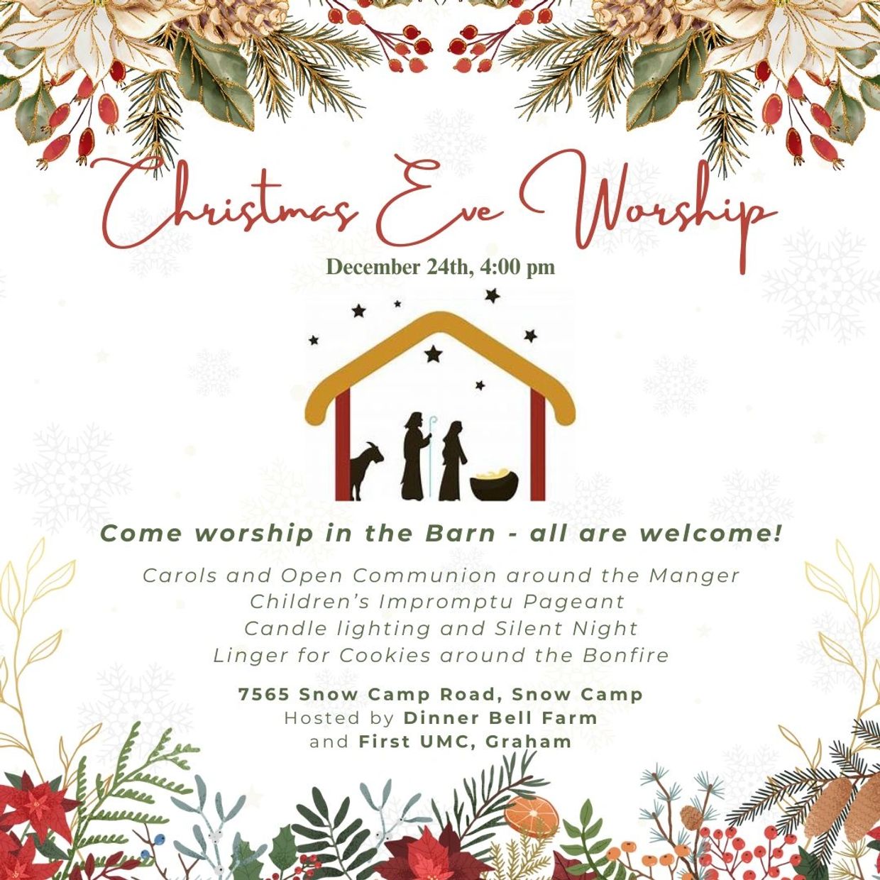 Carols / Children's Impromptu Pageant / Open Communion around the Manger / Candle lighting and Silent Night / Farm Animals / Invitation to linger for Cookies around the Bonfire
